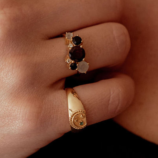 Pretend You're French Jewelled Ring in 14ct Gold Vermeil with Garnet, Grey Moonstone, Black Spinel, White Topaz.